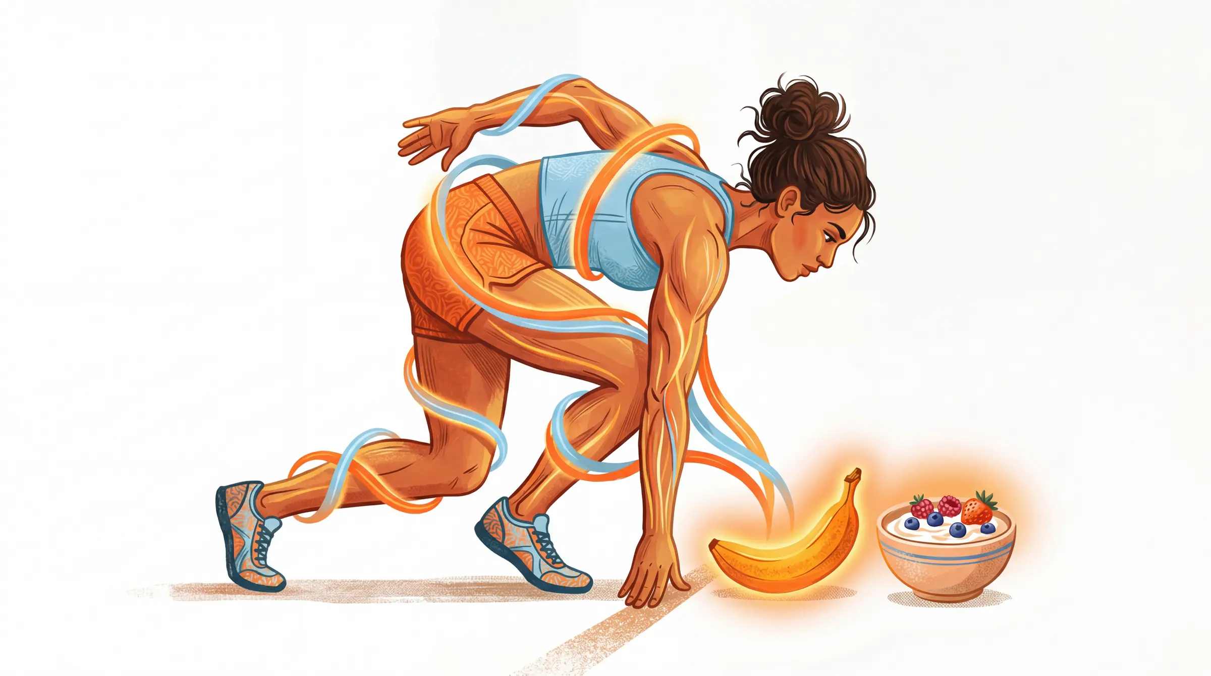 Stick to easily digestible carbohydrates with a small amount of protein — banana with almond butter, Greek yogurt with berries, or rice cakes with nut butter. Keep fat and fiber low to avoid digestive discomfort. Aim for 150-250 calories.